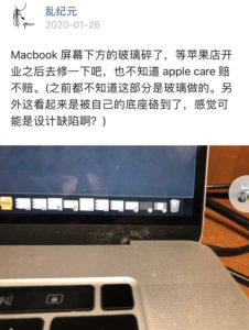 然后看到我apple care+还有800多天,说屏幕那个地方并不影响使用建议拿胶带贴一下,别让碎渣划了屏幕;键盘的那个问题可以到维修的地方问问,能不能找俩好的键帽换上。
