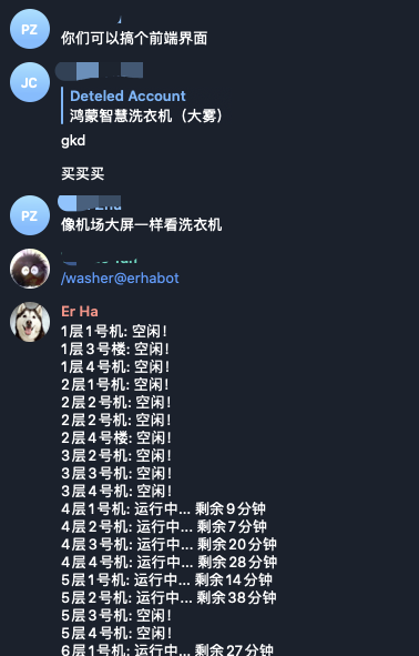 Linkai Zheng同学对这个接口也很感兴趣,基于上面的接口开发了telegram机器人 `/washer@erhabot`。