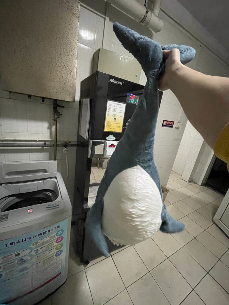 可能是受到了旋转的离心力影响,出浴时鲨鲨内部填充物都集中到了肚子,变成了生无可恋的球鲨。