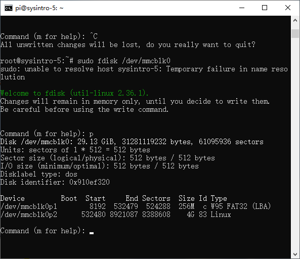 sudo reboot重启树莓派;⚠️执行此命令时注意已经退出fdisk的交互命令环境 (有 sysintro-# $ 的命令提示符)⚠️ -